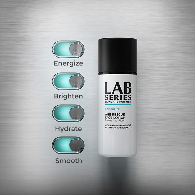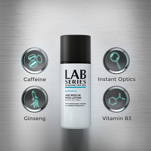 AGE RESCUE Face Lotion for men is a lightweight moisturiser that helps combat the appearance of fatigue and the first signs of ageing. - With Ginseng, Caffeine and Vitamin B3 (Niacinamide), it energises the look of your skin instantly and over 24 hours, fighting the look of fatigue and dullness. - Powerful hydrating actives help reduce the look of fine, dry lines. - With instant optics, works to provide brighter, healthier-looking skin. Your go-to men’s skin care moisturizer for healthier, smoother skin. Our best skin care for men, only by LAB SERIES.